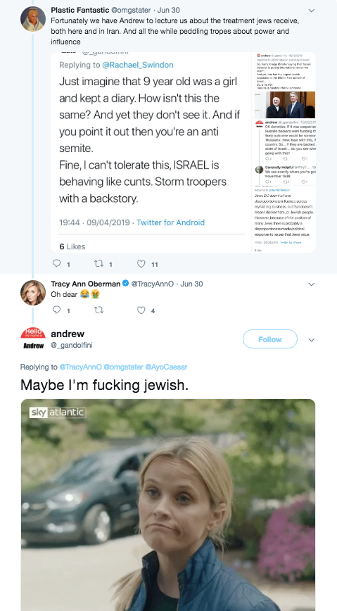 Andrew (@_gandolfini) trolled high profile antisemitism campaigner Tracy-Anne Oberman. I used screenshots to point out how he uses antisemitic stereotypes and lectures Jews about the Holocaust and antisemitism.