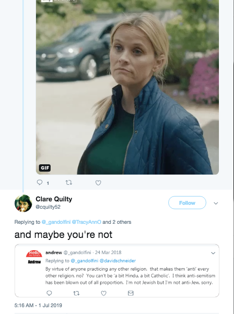 Clare Quilty coined ‘Quilty’s law‘. It is when an antisemite runs out of road in an argument and claims Jewish heritage, in a desperate attempt to claim they aren’t racist. It’s a bit like the ‘I have black friends’ argument but more extreme.