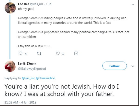 The fake jewish identity of Lee (@iles_mr) was used as cover for his racist stereotype about Jewish power. His false identity being unceremoniously stripped away is one of my favourite twitter moments of all time.