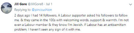 Jill (@jillgore8) claimed to be a floating voter who just happened to love Jeremy Corbyn and conveniently couldn’t see any antisemitism in the Labour Party.